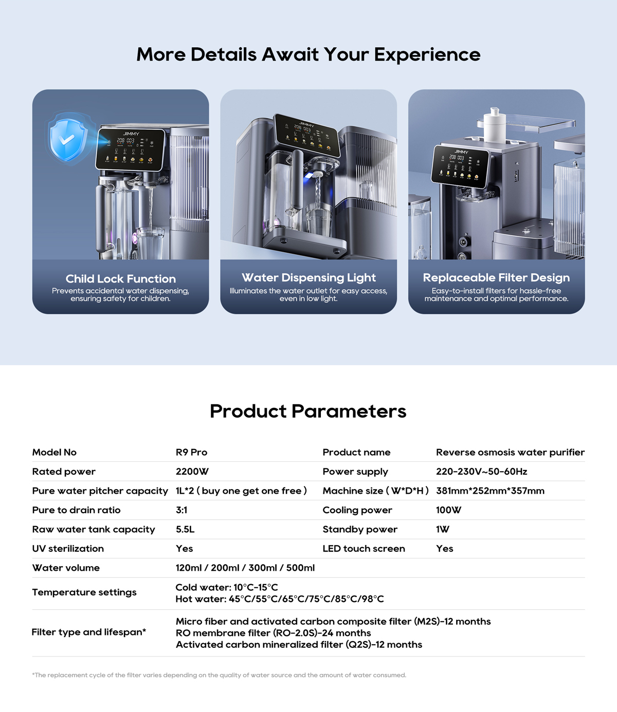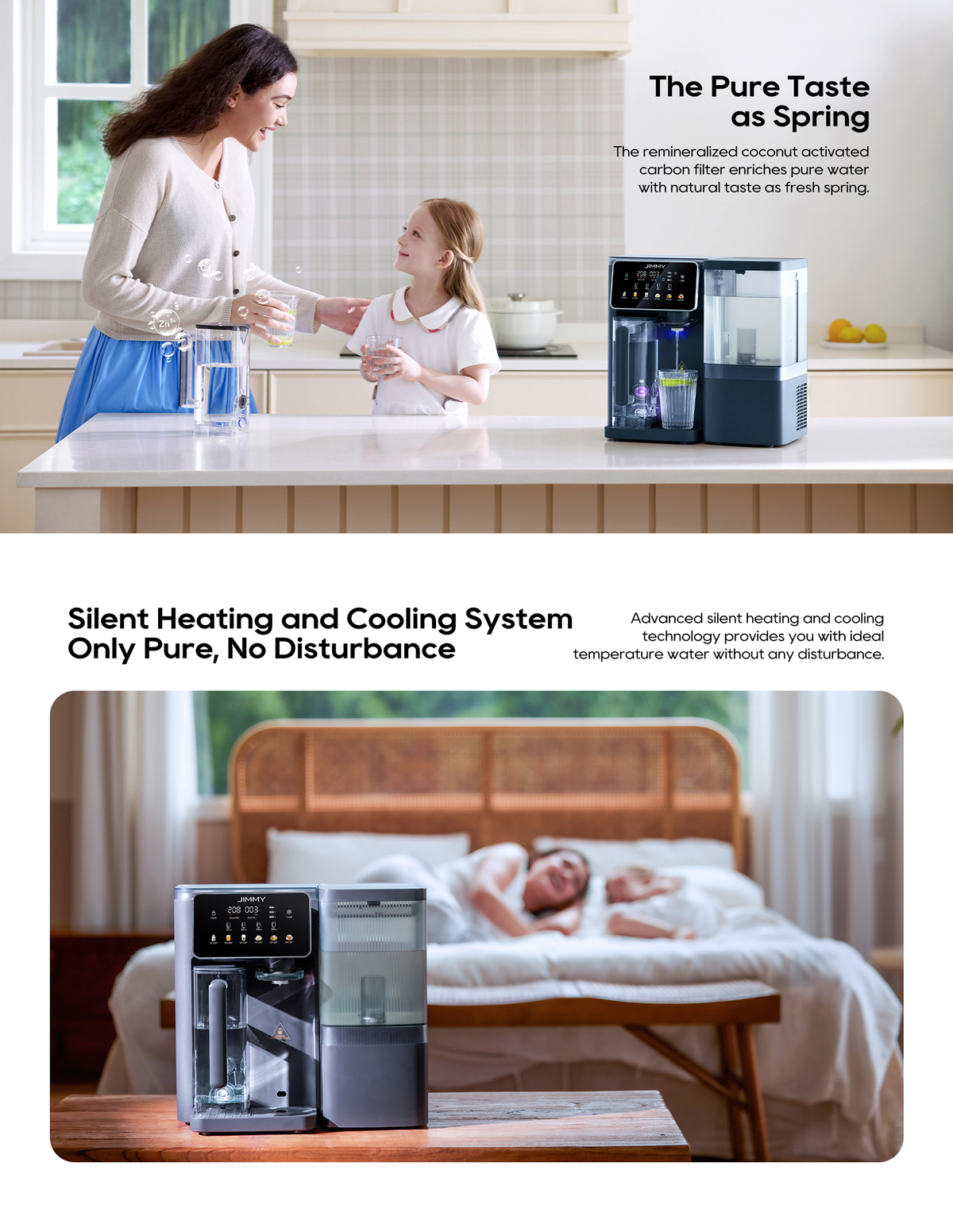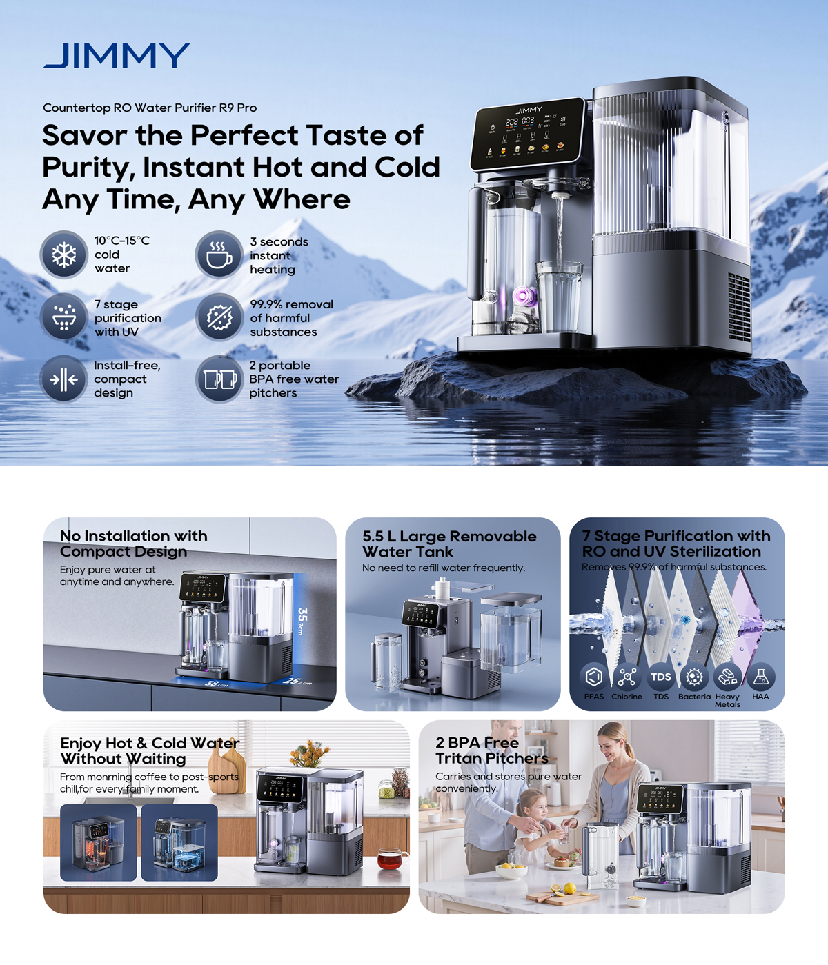 Uz tehnologiju reverzne osmoze, JIMMY R9 PRO isporučuje visokokvalitetnu, sigurnu, pitku vodu i postavljaja novi viši standard aparatima za izravno pročišćavanje vode s preciznom kontrolom temperature. Bez obzira pripremate li toplu vodu od 43°C za dječju formulu, kuhate kavu od 93°C, poslužujete li vodu za djecu ili pak želite svježu vodu za kućne ljubimce – JIMMY R9 PRO osigurava da svaki član obitelji može uživati u zdravoj, sigurnoj, ukusnoj i lako dostupnoj vodi.