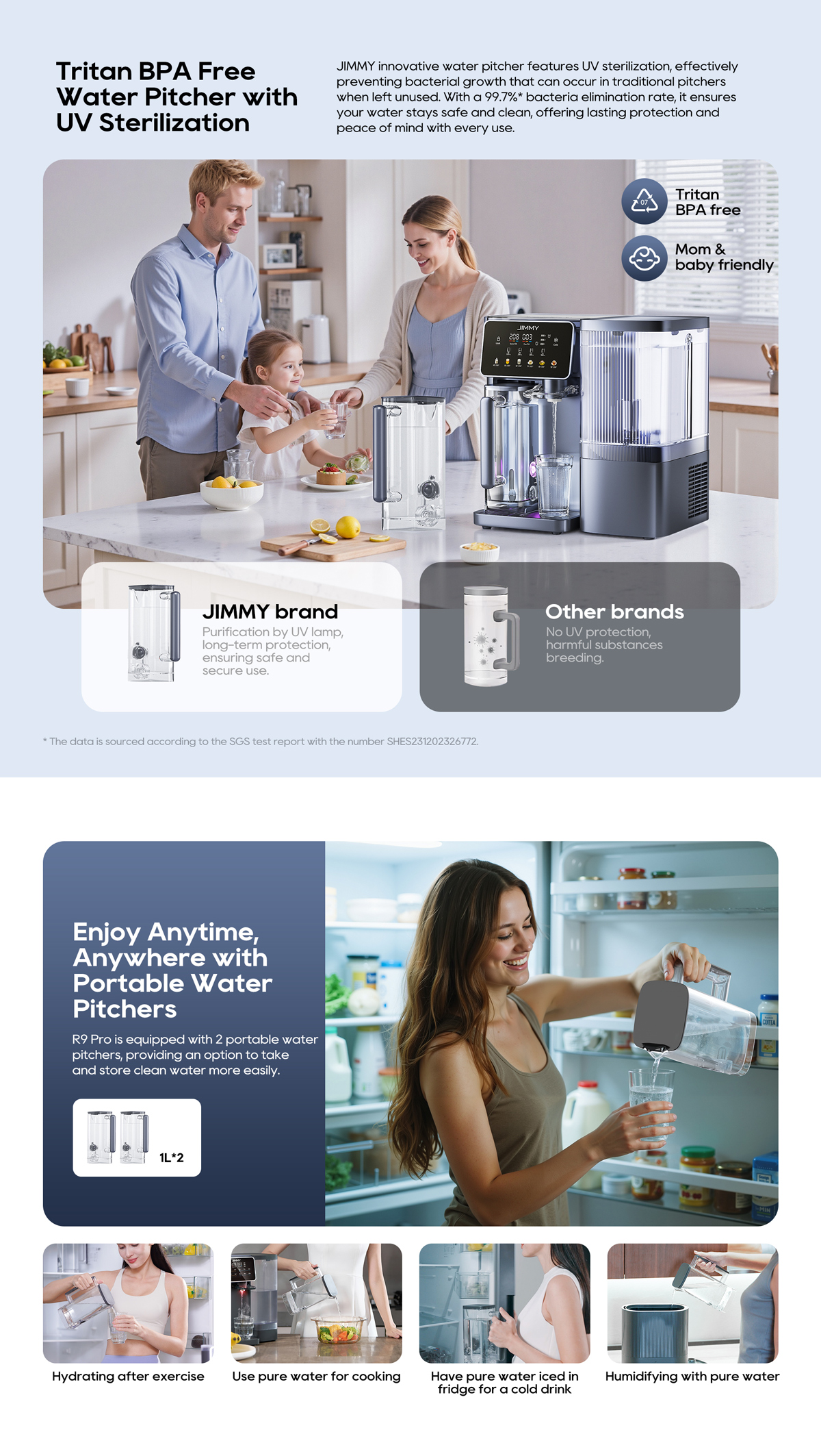 Jimmy R9 PRO pročišćivač za vodu dolazi s 2 uklonjiva vrča za jednostavan pristup i doziranje pročišćene vode u bilo kojem trenutku ili ih možete koristiti za pohranu vode u hladnjaku. Vrčevi za vodu izrađeni su od visokokvalitetnog tritan materijala, bez BPA, sigurni su i izdržljivi. Ugrađeno UV svjetlo na stražnjoj strani spremnika za vodu učinkovito ubija 99,99% bakterija, osiguravajući da je svaka kap vode svježa i zdrava, pružajući vama i vašoj obitelji iskustvo sigurne hidratacije.