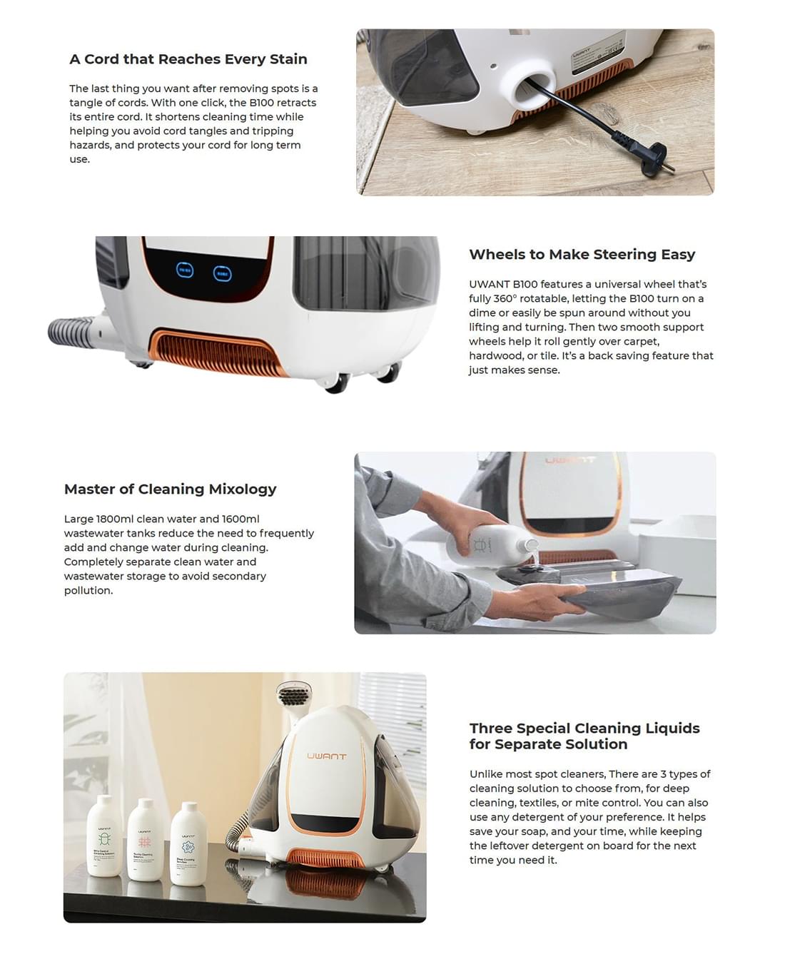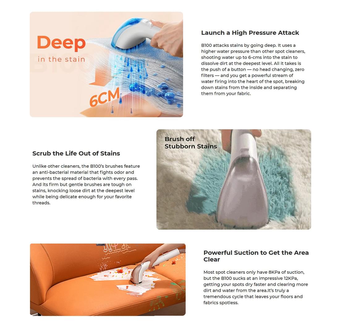 Znamo da uklanjanje mrlja može biti konstantna mukotrpna borba jer je tvrdokorne mrlje teško ukloniti, a boriti se s njima ručno još je teže. Nositi tepihe i pokrivače na čišćenje ili ih prati vani zasigurno nije optimalno rješenje. Zato predstavljamo UWANT B100-E, revolucionarni čistač mrlja koji se bori protiv njih na način na koji drugi čistači mrlja ne mogu.